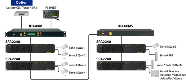 Le système IDA4 répond aux besoins de sonorisation Public Address et de surveillance des petites, moyennes et grandes gares. Il assure la sonorisation d’ambiance et les appels multi zone. Il est constitué d’un module contrôleur IDA4XM et en cascade, d’un ou plusieurs modules secondaires IDA4XMs permettant d’étendre le système jusqu’à 256 zones.
